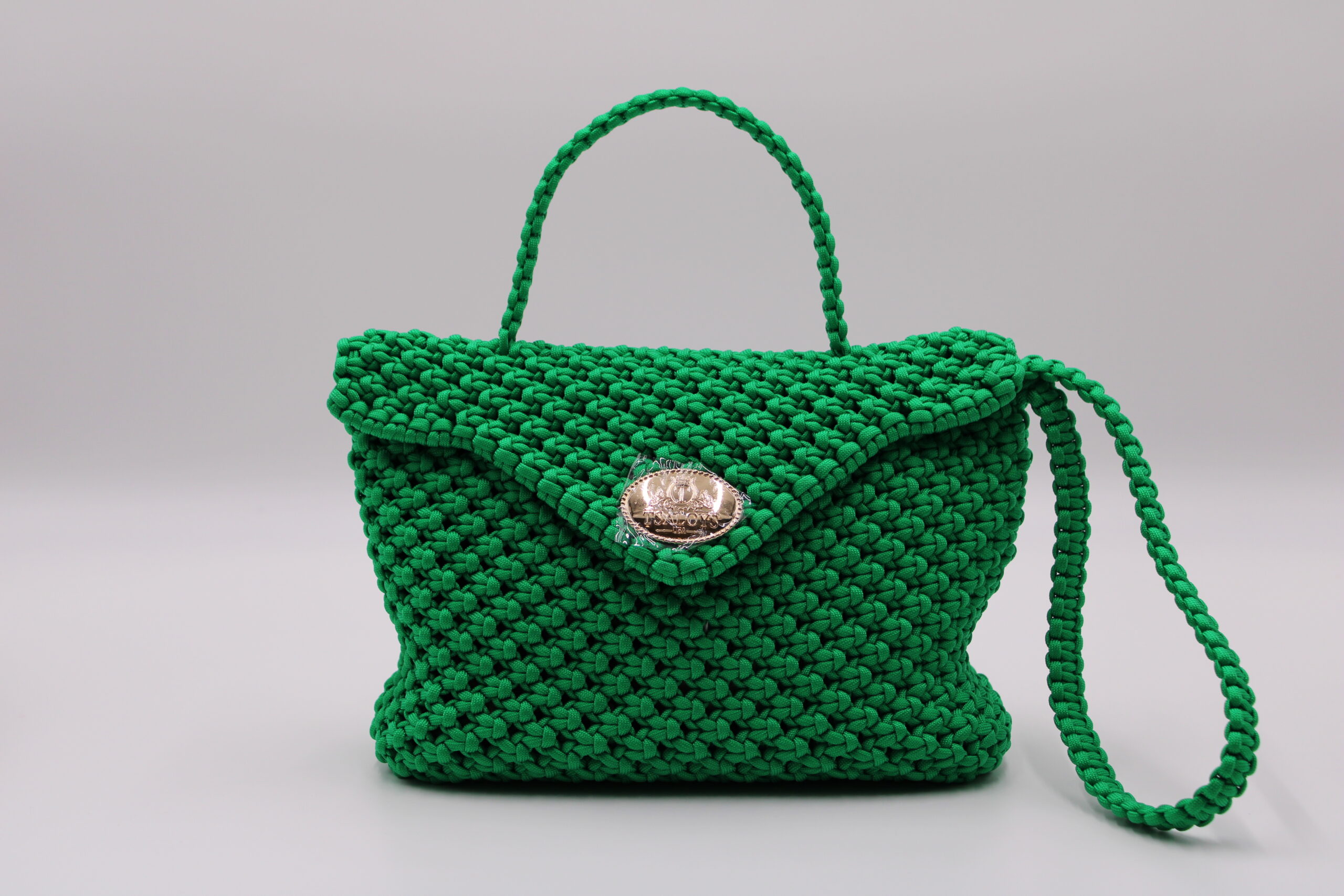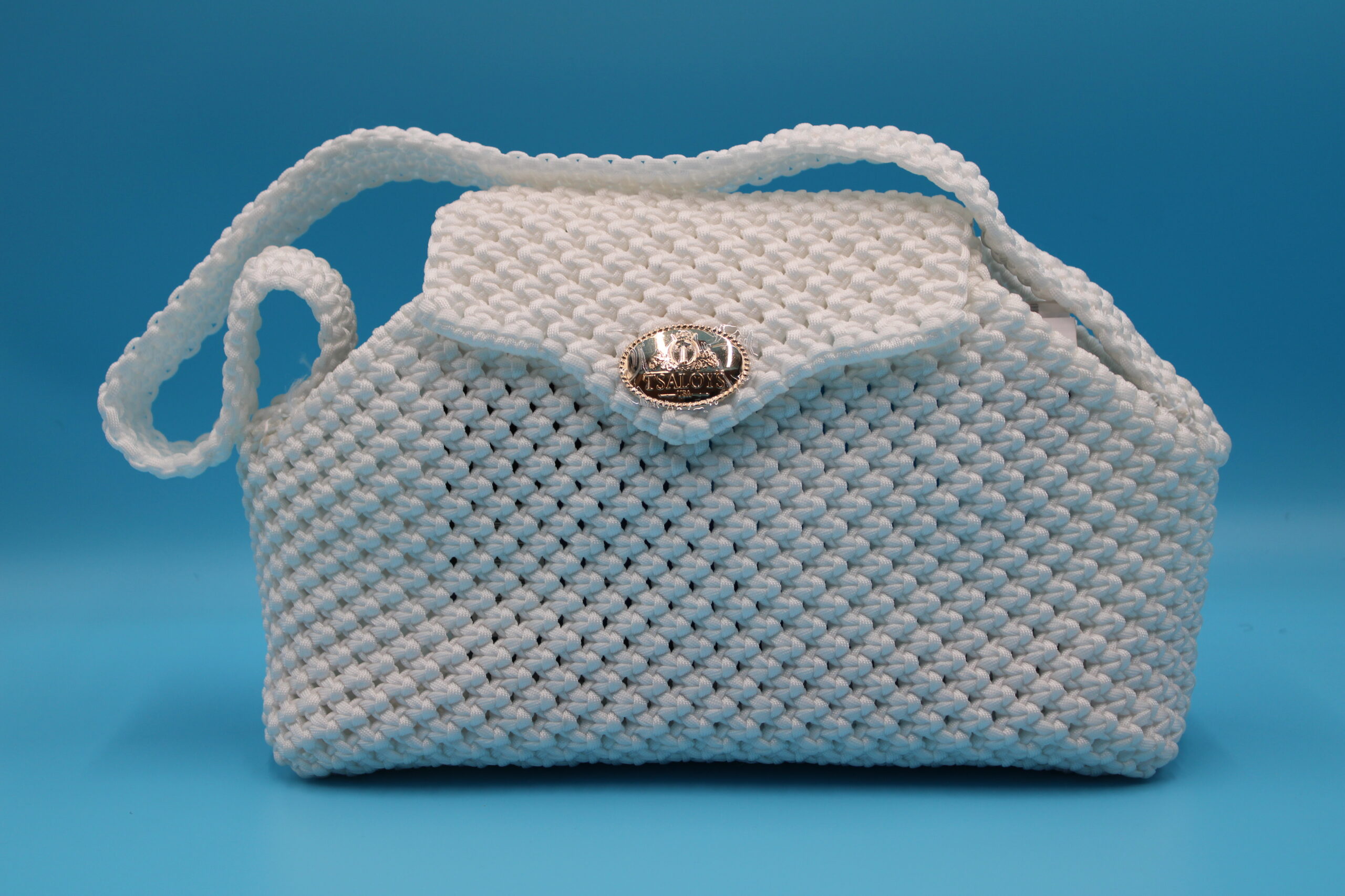Flap and closure in TSALOYS oval LOGO in zinc alloy with golden magnetic clasp.