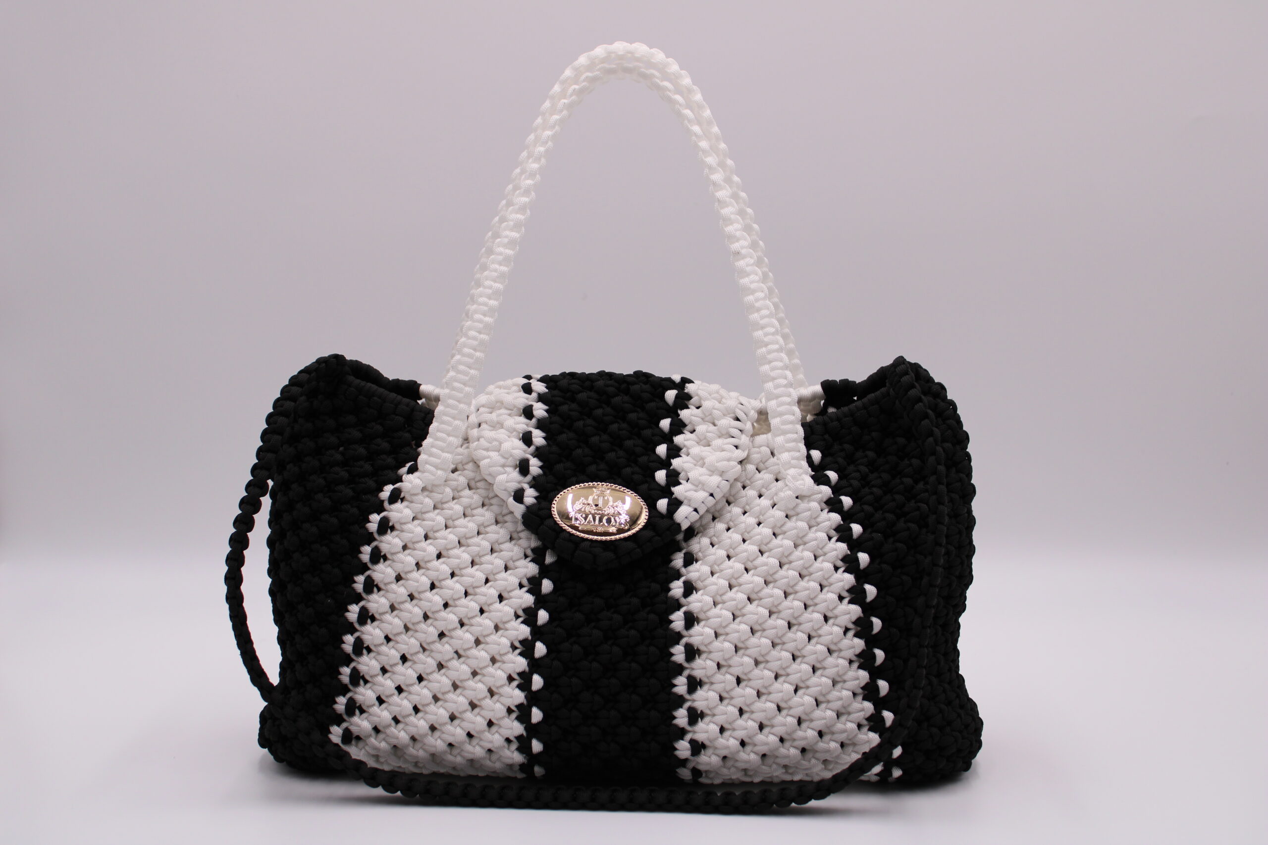 Flap and closure in TSALOYS oval LOGO in zinc alloy with golden magnetic clasp.